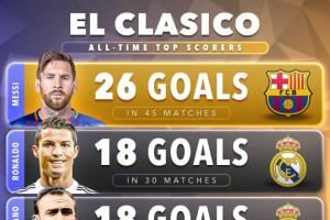 国家德比历史射手榜,梅西26球遥遥领先,C罗、迪斯蒂法诺18球并列第2,本泽马16球,劳尔15球,TOP5仅1名巴萨球员。