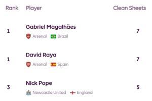 英超前十轮零封榜:拉亚、加布7次霸榜,萨利巴、廷伯、波普5次
