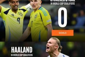 - 2025-11-18档次差距?哈兰德8场16球头名进世界杯,瑞典2.7亿锋线4场1球垫底